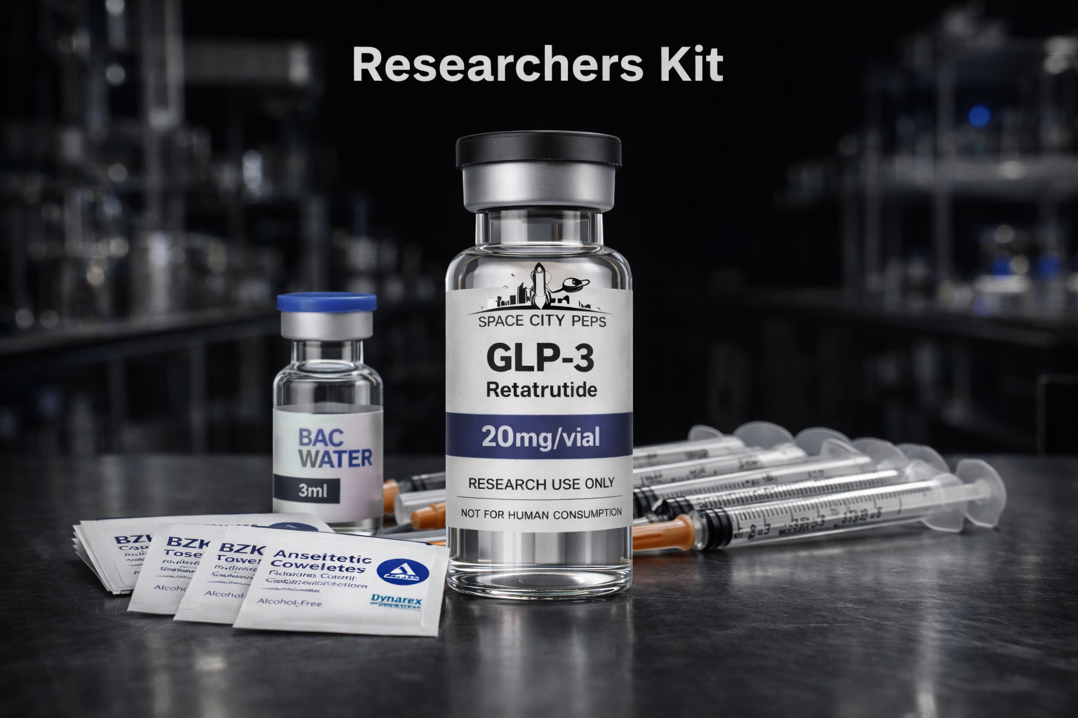 Research Kit includes RT20, 3mL BAC water, 6 total syringes (1 for reconstituting) and alcohol pads.